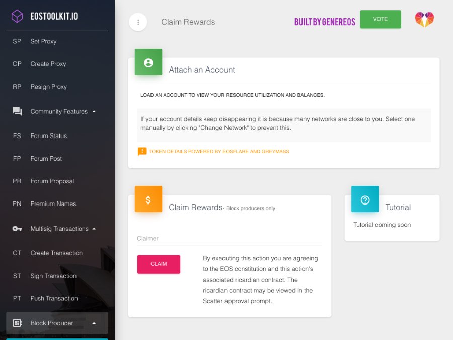 EOSToolkit is the premier free, open source interface for managing EOS accounts. Create, transfer, stake, vote and more with Scatter!