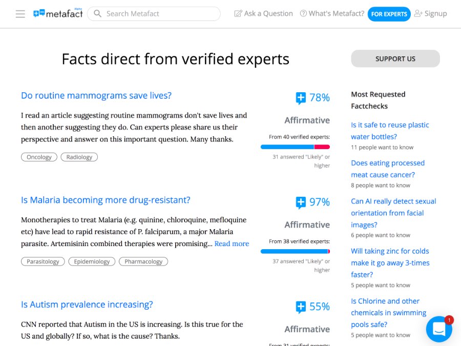 Metafact is a place to verify knowledge via the world's top experts. It's a platform to ask questions, learn the facts and share the truth.